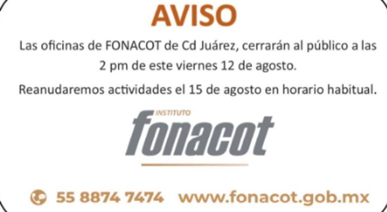 La Dirección del Fonacot en el estado informó que luego de cerrar por los hechos violentos del jueves en Ciudad Juárez, las oficinas reabrirán el lunes 15 de agosto.