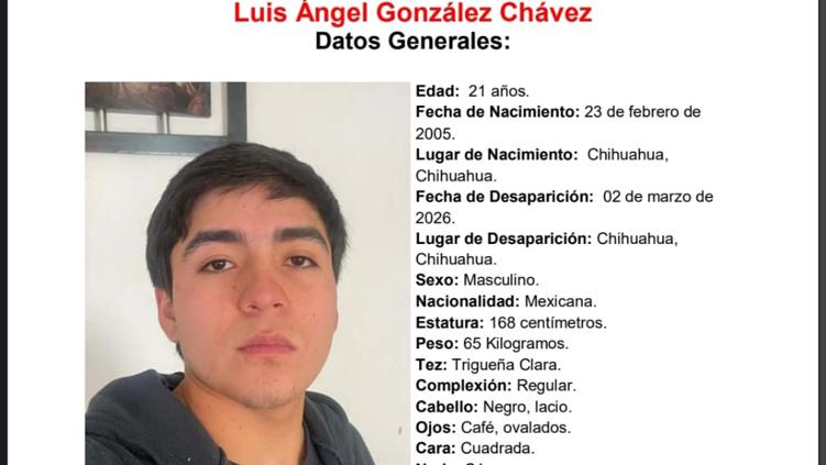 Autoridades activaron ficha de búsqueda para localizar a Luis Ángel González Chávez, de 21 años, desaparecido el 2 de marzo en la colonia Juan Escutia, en Chihuahua capital.