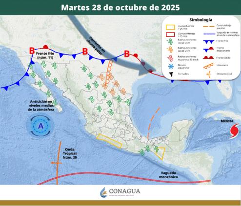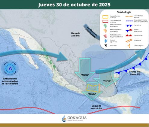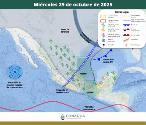 Sin embargo durante el miércoles 29 de octubre avanzará sobre el territorio mexicano y cubrirá prácticamente la mitad del país con una masa de aire frío, lo que traerá descenso de temperaturas.