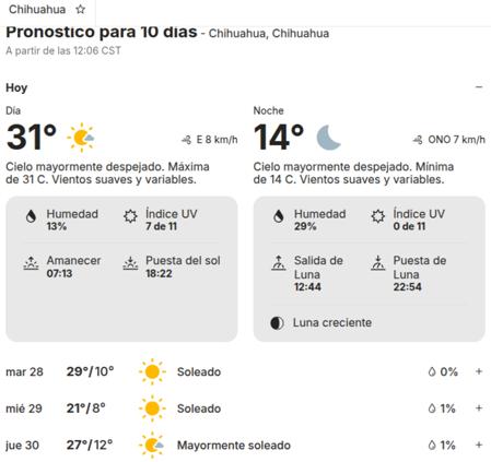 La cadena privada Weather Channel pronostica que el miércoles la ciudad de Chihuahua tendría una temperatura mínima de 8 grados y una máxima de 21.