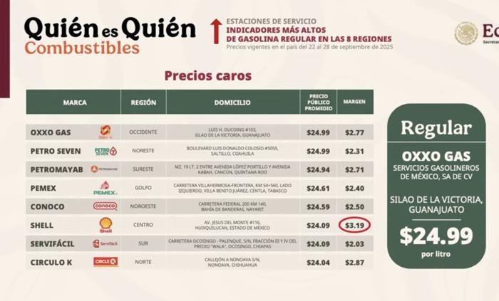 Entre las estaciones más caras también se encuentran Oxxo Gas en Silao, Guanajuato, y Shell en Huixquilucan, Estado de México, esta última con el mayor margen de ganancia, de 3.19 pesos por litro.