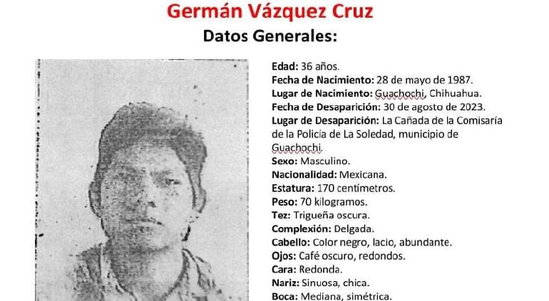 Germán Vázquez Cruz de 36 años, desapareció hace 6 meses, 2 semanas y 6 días en la localidad de La Cañada de la Comisaría de la Policía de La Soledad, municipio de Guachochi. Desde entonces su familia no sabe dónde está y piden ayuda para encontrarlo.