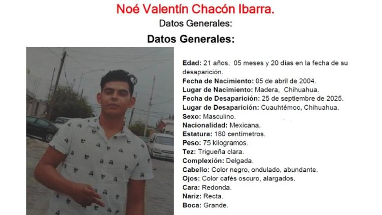 Autoridades estatales mantienen activa la búsqueda de Noé Valentín Chacón Ibarra, de 21 años, quien fue reportado como desaparecido el 25 de septiembre de 2025 en el municipio de Cuauhtémoc.
