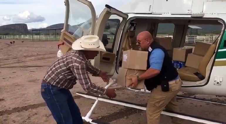 Con helicóptero llevaron apoyos a 18 familias en las comunidades de Potrero del Llano, Rancho Don Chuy y Rancho Malvinas en el municipio de Aldama, ya que las lluvias del último día elevaron el caudal del río Conchos.