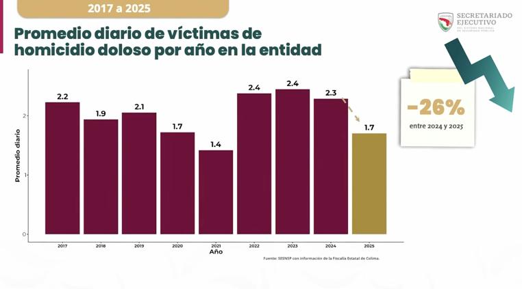 El Secretariado Ejecutivo del Sistema Nacional de Seguridad Pública informó que los homicidios dolosos en Colima disminuyeron 26% entre 2024 y 2025, al pasar de 2.3 homicidios diarios en promedio a 1.7, de acuerdo con el informe presentado en La Mañanera del Pueblo.