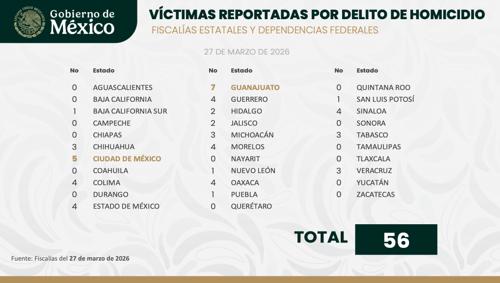 De acuerdo con el registro del Gobierno de México sobre víctimas de homicidio, elaborado con datos de fiscalías estatales y dependencias federales, durante el viernes 27 de marzo de 2026 se contabilizaron 56 homicidios en el país.