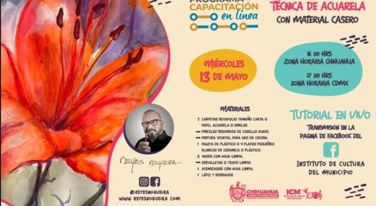 El Gobierno Municipal invita a todos los interesados en participar en el tutorial en línea de “Técnica de Acuarela con Material Casero,” impartido Carlos Alberto Reyes Nogueira, que será transmitido en vivo este miércoles 13 de mayo en punto de las 4:00 p.m.