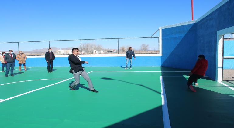 Inaugura Gobierno del Estado en el Ejido Álamos de Peña del municipio de Villa Ahumada, una cancha de fútbol rápido y una cancha de concreto para la telesecundaria, además, se remodela y acondiciona la plaza pública de esa localidad, en beneficio de sus habitantes.