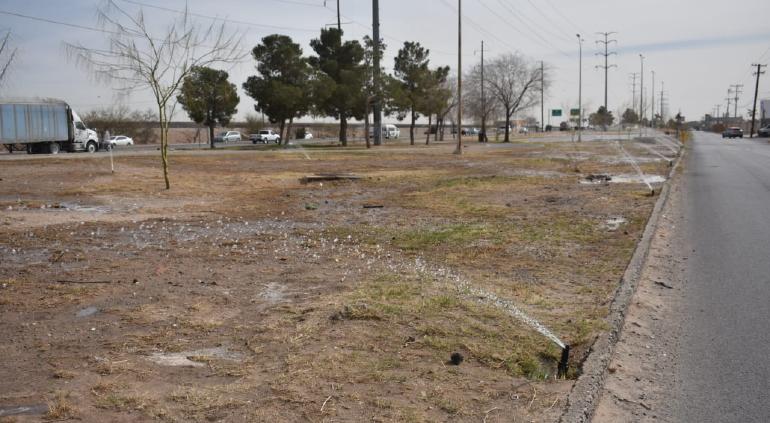 Personal del Gobierno Municipal trabaja en la instalación del sistema de riego en el parque lineal Cuatro Siglos, al norte de Ciudad Juárez.