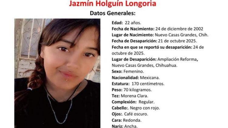 La Fiscalía solicita ayuda para encontrar a la jovencita Jazmín Holguín Longoria de 22 años, quien desapareció el 21 de octubre del presente año en Nuevo Casas Grandes. Por ahora se desconoce su paradero.