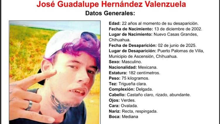 Autoridades del estado de Chihuahua solicitan el apoyo de la ciudadanía para localizar a José Guadalupe Hernández Valenzuela, joven de 22 años de edad al momento de su desaparición, ocurrida en el municipio de Ascensión.