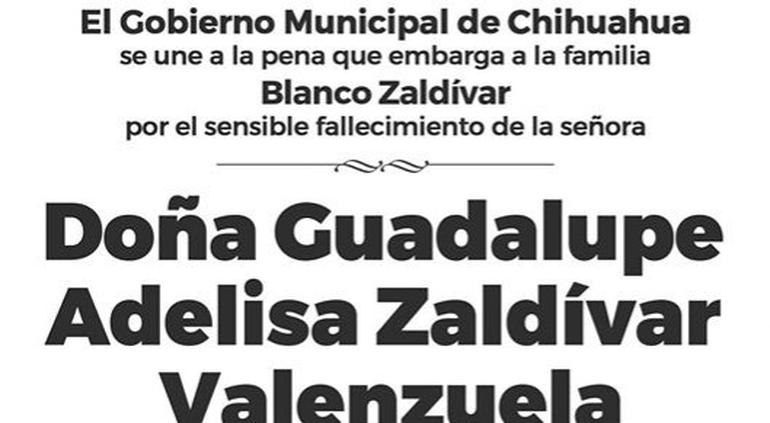El día de ayer falleció la señora Guadalupe Zaldívar Valenzuela, madre de Juan Blanco, quien fue presidente municipal (2004-2007) y diputado federal (2015-2018).