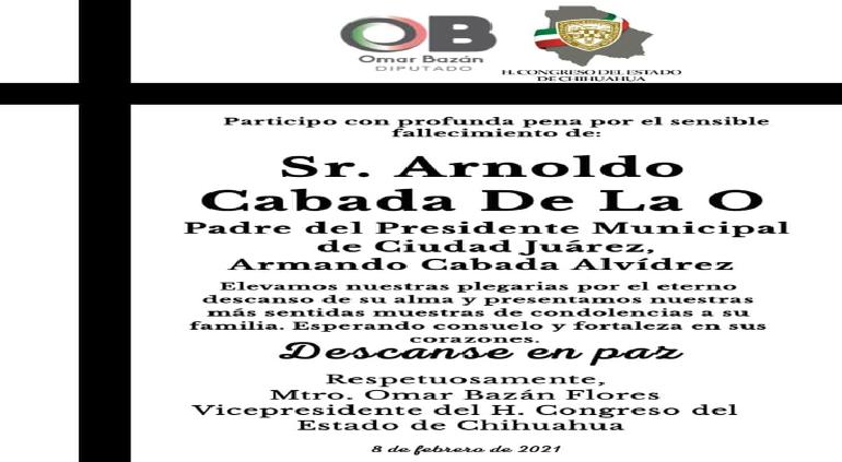 El diputado del Partido Revolucionario Institucional, Omar Bazán Flores, lamentó el fallecimiento del señor Arnoldo Cabada De La O, padre del alcalde de Juárez Armando Cabada.