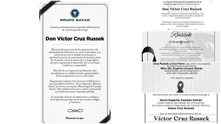 El Consejo Consultivo de Desarrollo Económico del Estado de Chihuahua (CCE) también lamentó profundamente su partida, expresando su solidaridad con la gobernadora Campos Galván y la familia Cruz Russek, deseando fortaleza ante esta irreparable pérdida.