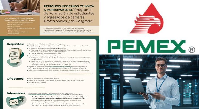 Petróleos Mexicanos anunció su ‘Programa de Formación de Estudiantes y Egresados de Carreras Profesionales y de Posgrado’, con el cual ofrece entrenamiento por hasta año y medio y apoyo económico para estudiantes o egresados de ingeniería en Sistemas Computacionales, Tecnologías de la Información y Comunicación y carreras afines. Aquí te decimos los requisitos para que te apuntes a la convocatoria, la cual se encuentra abierta.