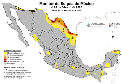 El Monitor de Sequía de México comentó: "Durante la segunda quincena de febrero de 2026, el ingreso de tres frentes fríos al territorio mexicano, así como eventos de norte y canales de baja presión, favoreció la ocurrencia de precipitaciones superiores al promedio climatológico, principalmente en el centro, sur y oriente del país, además de la península de Yucatán.