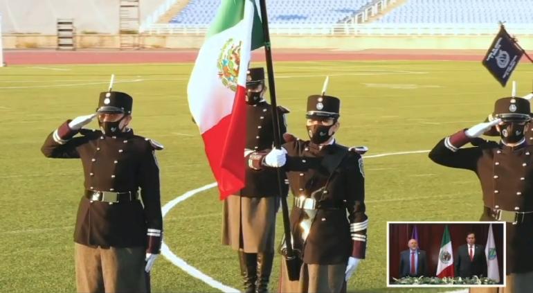 Comenzó el evento con honores a la bandera y entonación del Himno Nacional que la escolta de la Universidad celebró desde el Estadio Universitario, al norte de la ciudad, con transmisión al mismo tiempo en que Luis Fierro se presentó desde Rectoría al lado de Raúl Sánchez Trillo, secretario general de la UACH.