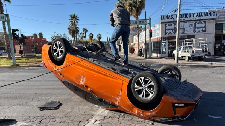 Un Nissan Sentra color cobre volcó aparatosamente tras chocar de costado con un Nissan Versa gris en Guadalupe Victoria y Díaz Ordaz, en el Centro; ambos conductores salieron ilesos.