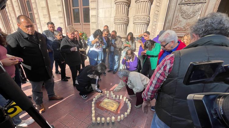 Colocaron veladoras alrededor de la placa que se colocó al exterior de Palacio de Gobierno, del lado de la calle Aldama, sitio en donde falleció Marisela después de una agresión armada.