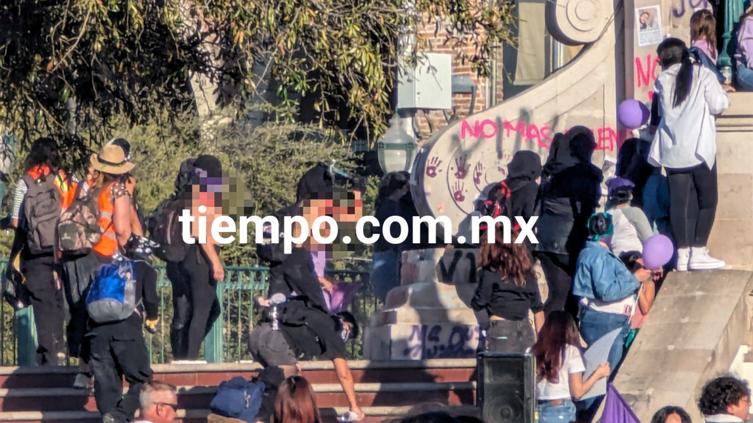 Manifestantes de la marcha del 8M grafitearon y dieron de martillazos en la cantera de la base de la escultura del Ángel en la Plaza Mayor, luego del amplio perímetro de vallas metálica que se instaló en el Centro.