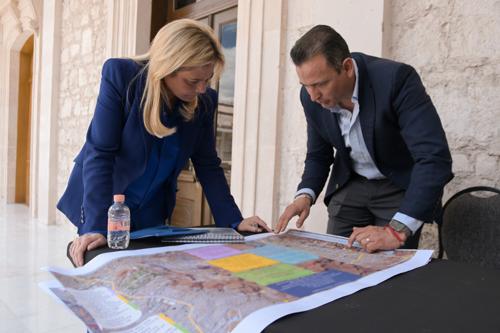 En los planos que llevó el Alcalde pueden verse cuadros con anotaciones y marcas en el trazo de la vialidad que tendrá 20.9 kilómetros de largo cuando sea totalmente construida.