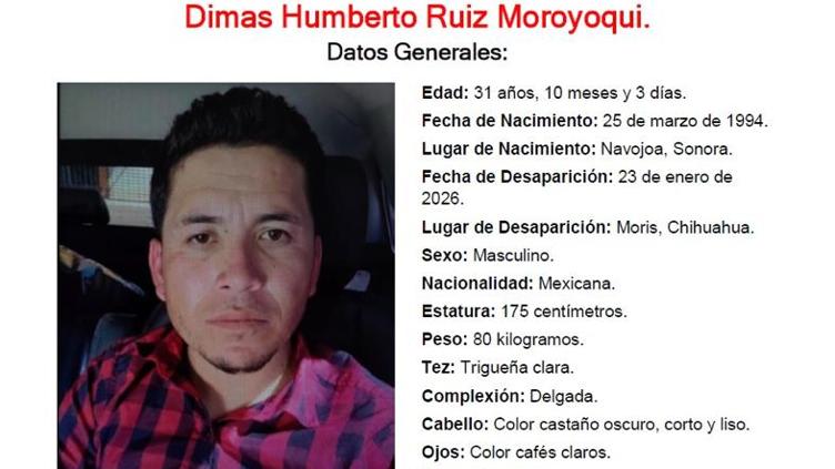 Fiscalía pide apoyo para localizar a Dimas Humberto Ruiz Moroyoqui, desaparecido desde el 23 de enero en Moris, Chihuahua.