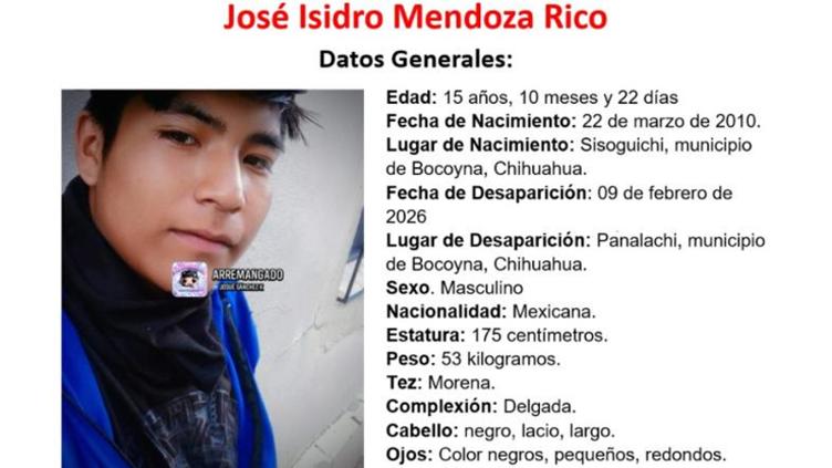 La Fiscalía solicita ayuda para encontrar al joven José Isidro Mendoza Rico de 15 años, quien desapareció el 9 de febrero del presente año en un rancho de Bocoyna. Por ahora se desconoce su paradero.