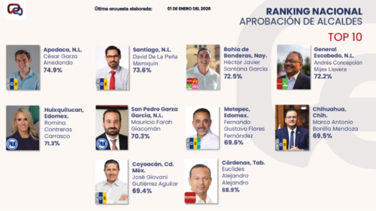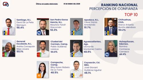 El primer lugar lo tiene César Garza, alcalde de Apodaca (Nuevo León), con 74.9%. Le siguen los alcaldes de Santiago (Nuevo León), Bahía de Banderas (Nayarit), General Escobedo (Nuevo León), Huixquilucan (Estado de México), San Pedro Garza García (Nuevo León) y Metepec (Estado de México).