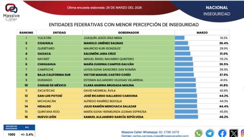 Publicó Massive Caller su última encuesta de aprobación de los gobernadores de todo México, con Maru Campos Galván de Chihuahua en sexto lugar a finales de marzo 2026.