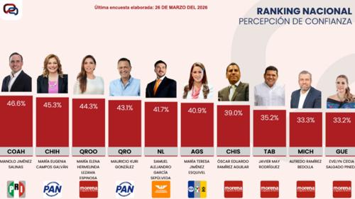 A los encuestados les preguntaron también por percepción de confianza. Maru Campos tiene el segundo lugar nacional con 45.3%, seguido de Manolo Jiménez de Coahuila.