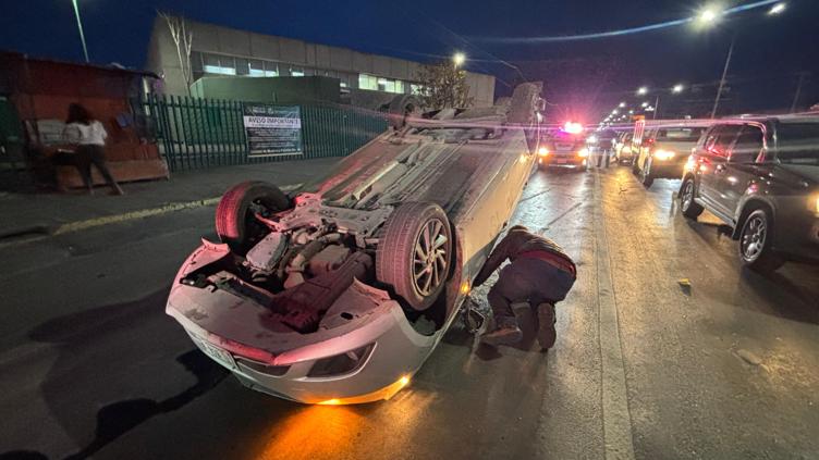Un conductor perdió el control de un Chevrolet Aveo y volcó sobre su toldo en el cruce de las calles Pino y Tecnológico, frente a la clínica 44. El accidente ocurrió por un presunto exceso de velocidad y no dejó personas lesionadas.