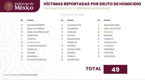 En ese informe destacaron solamente a dos estados: Chihuahua y Sinaloa. En el primero registraron nueve víctimas reportadas por delito de homicidio y en el segundo, ocho.