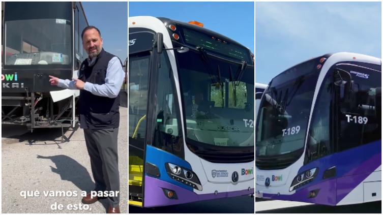 Santiago de la Peña, secretario General de Gobierno, visitó los patios de la Operadora de Transporte (OTV) donde revisó los nuevos Bowi modelo Mercedes Benz 2026 recién adquiridos y los contrastó con unos viejos prácticamente desarmados.