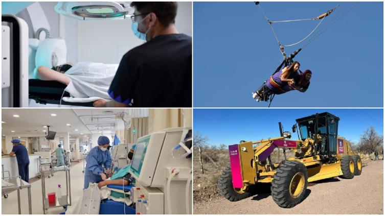 Fotos ilustrativas sobre el búnker de cancerología, Skycoaster, centro de salud y rehabilitación de caminos