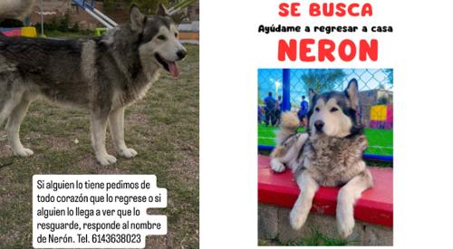 Su dueña, Camila Villagran, pone a disposición de la comunidad el teléfono 614-363-8023 para que se comuniquen con ella en caso de encontrar aNerón.