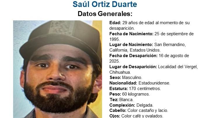 El Gobierno de Chihuahua ofrece $200,000 por datos sobre Saúl Ortiz Duarte, desaparecido el 16 de agosto de 2025 en el Vergel. Tiene 29 años, barba cerrada y una cicatriz en el brazo izquierdo; se desconocen más detalles de su vestimenta.