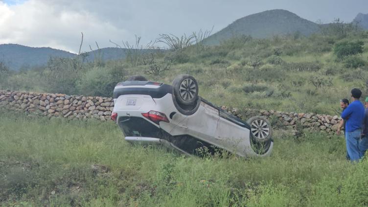 El conductor de una camioneta Nissan, Kicks, viajaba de Juárez a Chihuahua, cuando perdió el control del volante y salió del camino. Quedó la camioneta sobre su toldo después del percance.