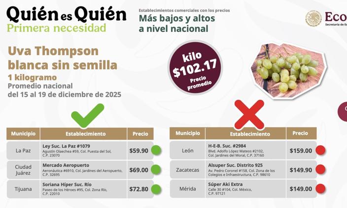 Durante la presentación semanal, el procurador federal del consumidor, César Iván Escalante Ruiz, detalló que, a nivel nacional, los precios más bajos de la uva se encontraron en La Paz (59.90 pesos), Ciudad Juárez (69.00 pesos) y Tijuana (72.80 pesos); mientras que los más altos se ubicaron en León (159.00 pesos), Zacatecas (149.90 pesos) y Mérida (149.00 pesos).