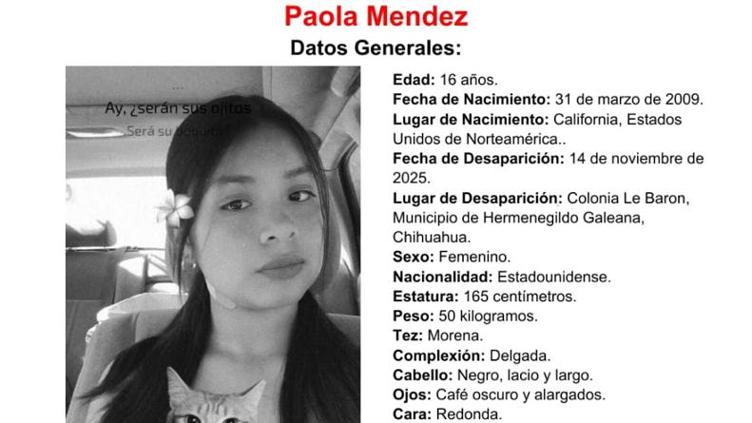 La adolescente de 16 años, Paola Méndez, originaria de California, Estados Unidos, permanece desaparecida desde el 14 de noviembre de 2025 en la colonia Le Barón, municipio de Hermenegildo Galeana, Chihuahua, según el reporte emitido por la Fiscalía General del Estado.