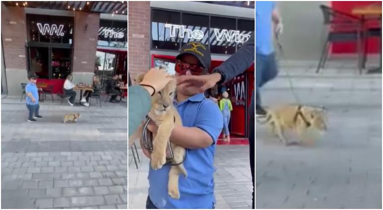 A través de redes sociales fueron difundidas fotografías del momento en que ciudadanos captaron a una persona paseando a un cachorro de león en la plaza comercial.