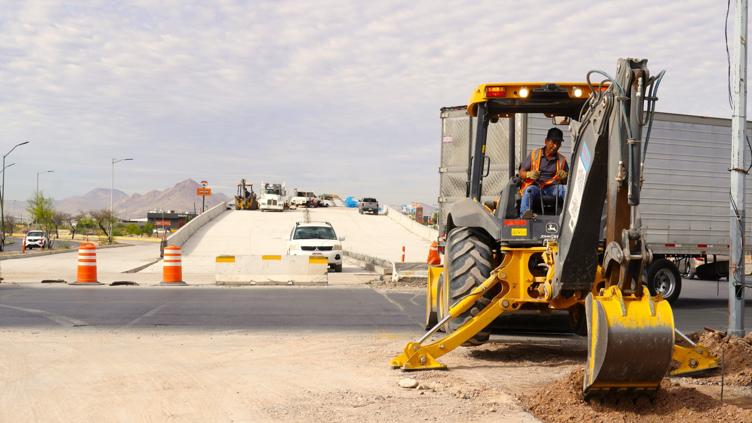 La Dirección de Obras Públicas, avanza en la construcción del paso superior que busca mejorar la movilidad en el cruce de la carretera Chihuahua-Aldama y la avenida Fuerza Aérea.