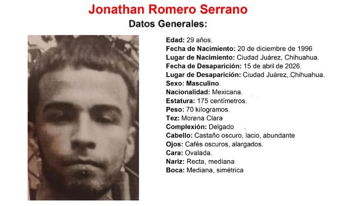 Jonathan Romero de 29 años de edad fue visto por última vez el día 15 de abril de 2026 en Ciudad Juárez, desde entonces se desconoce su paradero.