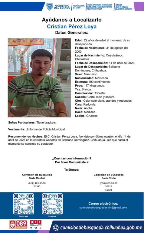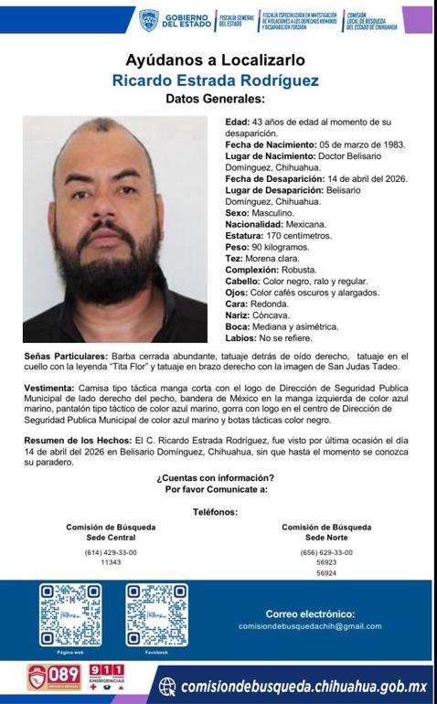 La Fiscalía emitió fichas de búsqueda para los tres policías de Belisario Domínguez desaparecidos, incluyendo al director de la corporación, quienes fueron vistos por última vez el 14 de abril.
