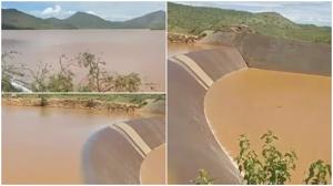 La presa Abraham González, en el municipio de Guerrero, fue captada desbordando, luego de las lluvias abundandos y persistentes este verano, haciendo que llegue a su límite de llenado.