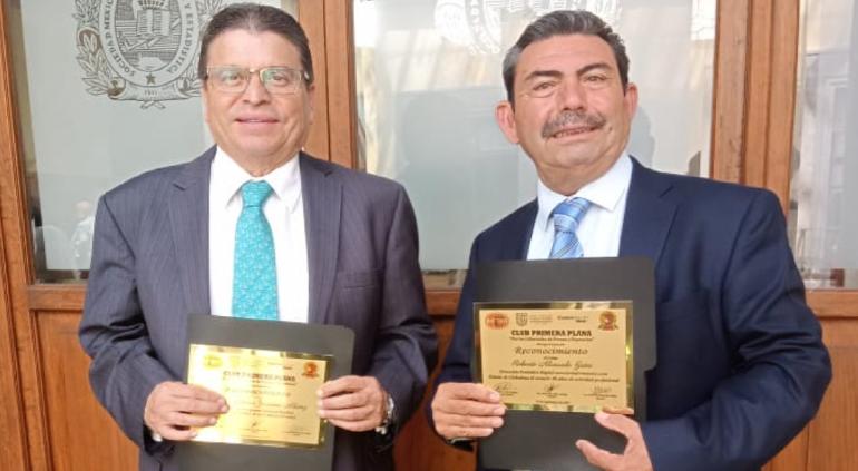 En una emotiva ceremonia en el Auditorio Miguel Hidalgo y Costilla entregaron un reconocimiento a los destacados periodistas Martín Zermeño y Roberto Alvarado por su trayectoria y contribución a la profesionalización del gremio periodístico.