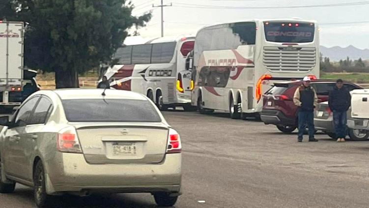 Grupo de productores que se manifestaron en la caseta Saucillo detuvieron dos autobuses que iban a Ciudad de México para el mitin de la presidenta Claudia Sheinbaum, incluso ponchando llantas.