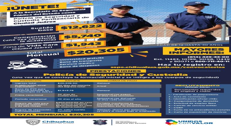 La Secretaría de Seguridad Pública del Estado, emitió convocatoria e invita a la población a integrarse como elementos de la Policía de Seguridad y Custodia Penitenciaria en Juárez, obteniendo un ingreso mensual de hasta 20 mil 305 pesos.