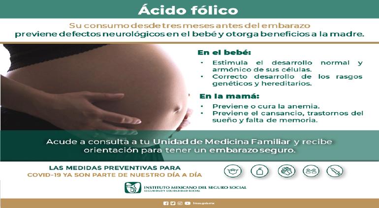 El Instituto Mexicano del Seguro Social (IMSS) en Chihuahua promueve la toma de ácido fólico en las mujeres que desean ser mamás, entre tres y seis meses antes del embarazo y en el primer trimestre de la gestación, pudiendo prolongarse hasta su término.
