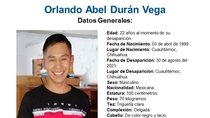 La Fiscalía General del Estado y la Comisión de Búsqueda del Estado de Chihuahua, mantiene activa una pesquisa para dar con el paradero de un joven desaparecido desde agosto de 2021, ofreciendo una recompensa económica a quien aporte información veraz y útil.