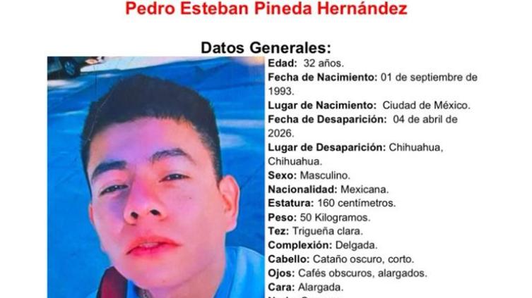 Autoridades estatales emitieron una ficha de búsqueda para localizar a Pedro Esteban Pineda Hernández, de 32 años, quien fue reportado como desaparecido el pasado 4 de abril de 2026 en la ciudad de Chihuahua.